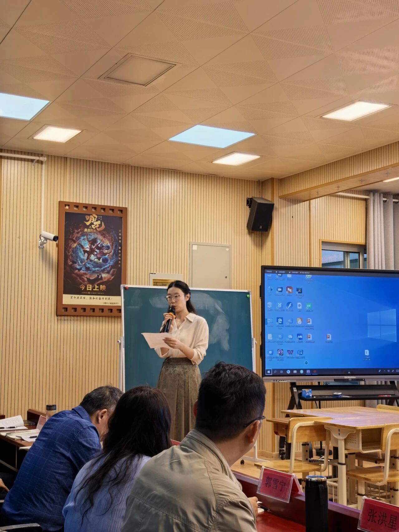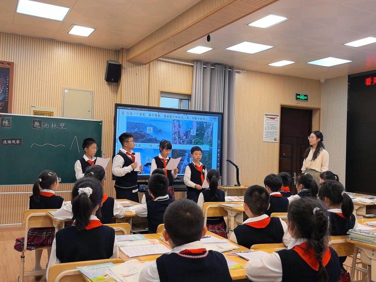 活动的第一部分为课例展示。第一节课由紫金小学李雪雯老师执教四上第三单元《古诗三首》第二课时。李老师聚焦《题西林壁》,延续"读—说—悟—比"的学习路径。先以《暮江吟》的"连续观察"导入,引导学生解题理解"题"的含义,规范书写"题、缘"等字。在"悟"的环节,学生找出"横、侧、远、近、高、低"等关键词,认识多角度观察的方法,并通过想象写作和图片展示,体会从不同视角看到的庐山变化。而后引导学生思考"不识庐山真面目"的原因,领悟"整体观察"的重要性。最后通过小组合作比较《暮江吟》与《题西林壁》的观察方法与情感表达,总结多角度、整体观察的道理,完成知识迁移。