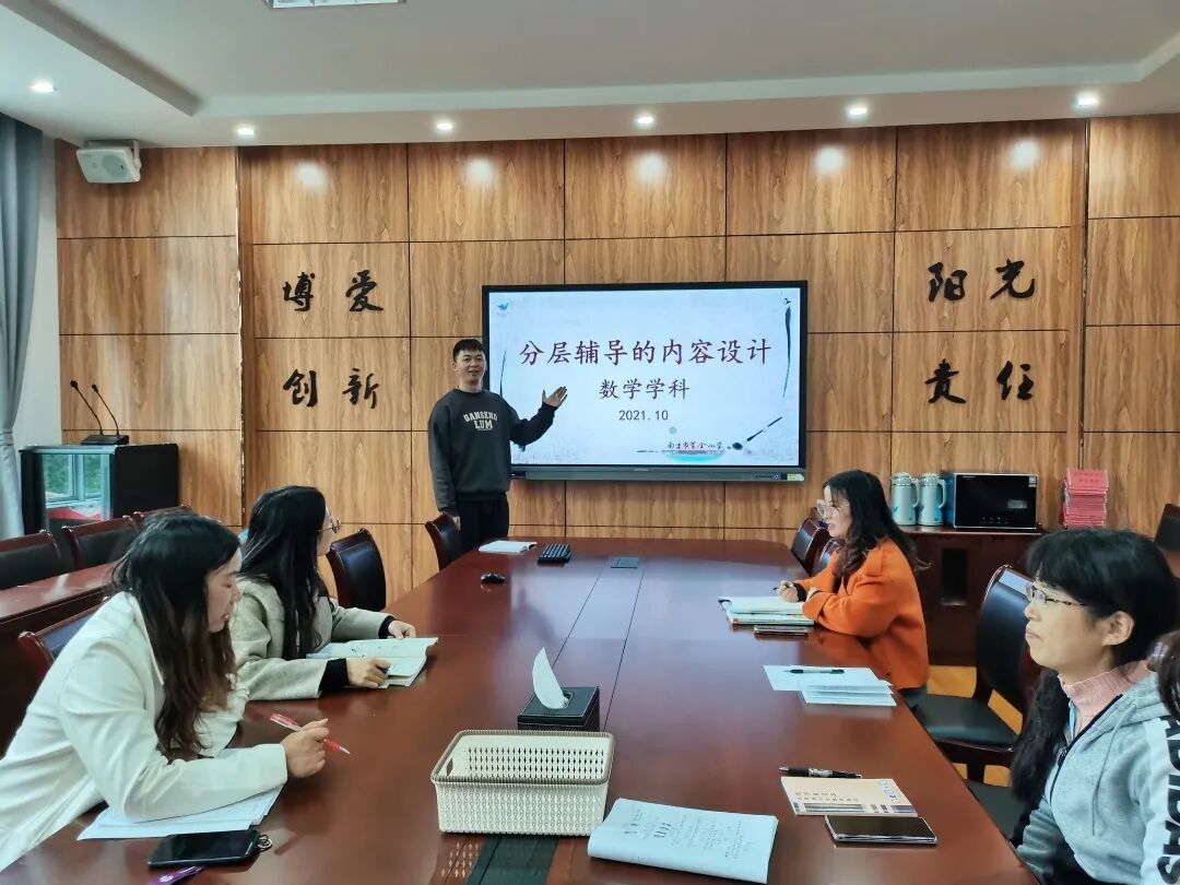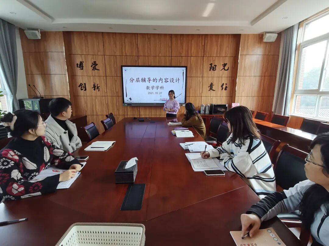 思行并举解疑难 高效落实促发展 ——记紫金小学数学组集体备课(三) 自古逢秋悲寂寥,我言秋日胜春朝。在这个收获的季节,紫金小学数学组全体教师齐聚会议室,进行了集体备课。这次集体备课的主题是“分层辅导的内容设计”。 首先,由方强飞老师分享了王娟主任的分层辅导示范课:将全班按同质分组,教师在课堂上出示6道练习题,提出明确要求,每一组至少选择3道题目,完成后小组交流,每个小组再商量挑选一道题,由代表上台讲解,讲解完毕后,由小组长批改加 听完方老师的分享,其他老师们也发表了自己对于分层辅导的看法。史雪萍老师说:“要保证所有人都能完成水平一的题目,更高层次的学生完成水平二。”伏湘老师说:“各个小组可以起一个特别的名字,并且小组汇报的形式还需要训练。”蔡美玲老师说:“教师在设计练习题时,要注意难度等级不同,题量不能太大。”季敏老师说:“要协调作业与辅导的时间,在保证作业完成的同时,教师更要注重分层辅导的质量。” 经过此次交流分享,相互答疑解惑,紫金小学的数学老师们又收获了宝贵可行的方法和建议,相信今后老师们在实际行动中会一步一步认真落实,一点一滴促进发展。